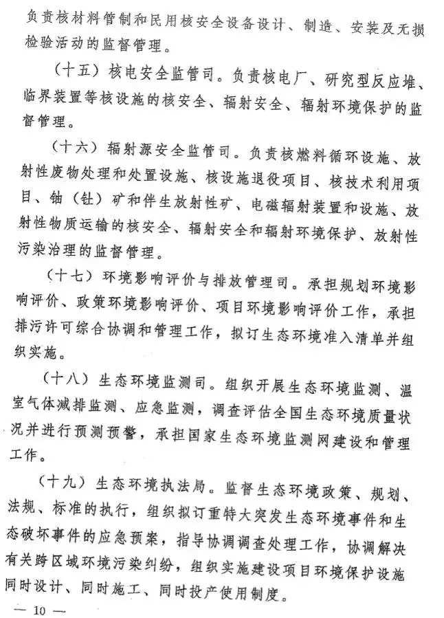 導讀:據(jù)了解,生態(tài)環(huán)境部“三定方案”于近日印發(fā)。生態(tài)環(huán)境部整合了環(huán)境保護部的職責,國家發(fā)展和改革委員會的應對氣候變化和減排職責,國土資源部的監(jiān)督防止地下水污染職責,水利部的編制水功能區(qū)劃、排污口設置管理、流域水環(huán)境保護職責,農業(yè)部的監(jiān)督指導農業(yè)面源污染治理職責,國家海洋局的海洋環(huán)境保護職責,國務院南水北調工程建設委員會辦公室的南水北調工程項目區(qū)環(huán)境保護職責。